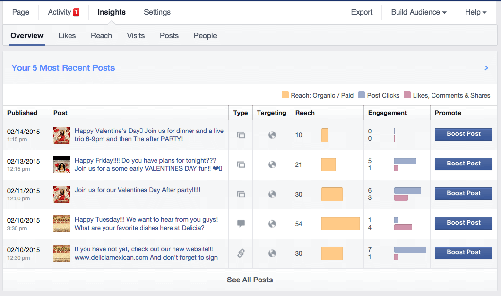 For every post, you share on Facebook, Insights records its reach and engagements. Check your Page Insights, click Posts and below the graph showing times your fans are online, you’ll see ‘All Posts Published’.
